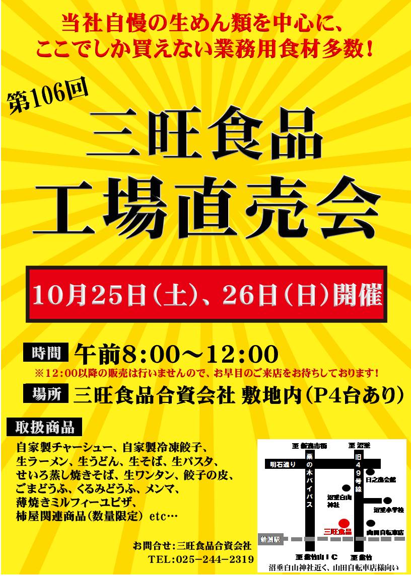 第106回 工場直売会 開催のお知らせ 2025.10.22 新着情報 今週末に直売会を開催いたします! 皆様のご来店、心よりお待ちしております! 開催概要 開催日:10月25日(土)、26日(日) 営業時間:午前8:00~12:00 場所:三旺食品合資会社 敷地内(駐車場4台あり)